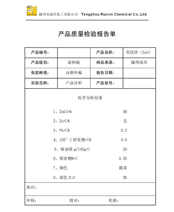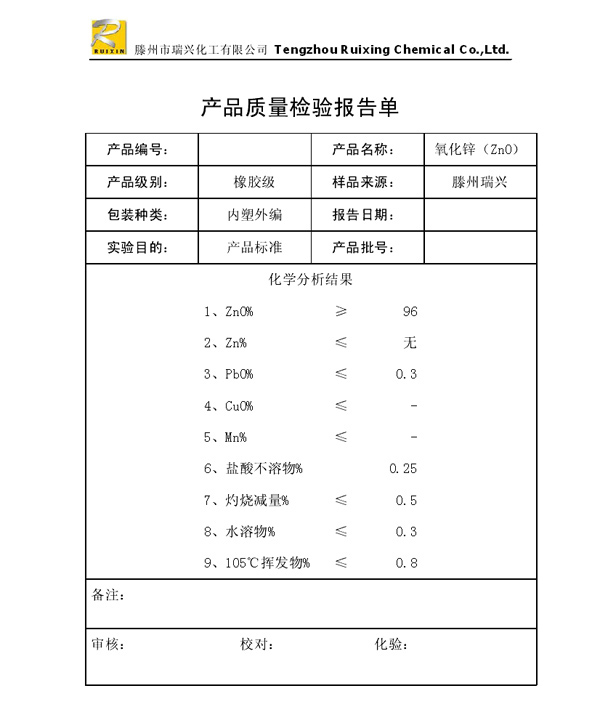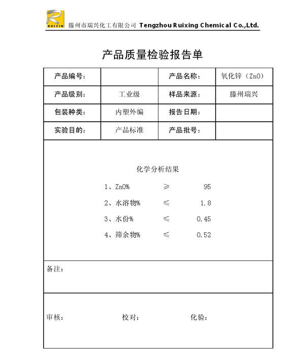 瑞興化工有限公司是生產氧化鋅的重點企業,于2008年通過ISO9001:2008質量管理體系認證?!叭鹋d”牌氧化鋅在國內擁有較大穩定的市場,并遠銷東南亞、中東、中南美等國家和地區,在國內外享有較高聲譽。